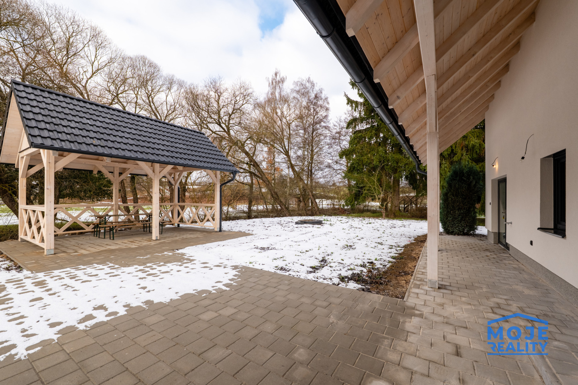 Venkovní altán v jednotném stylu domu – stejný krov i stejné střešní tašky.Technické parametry: