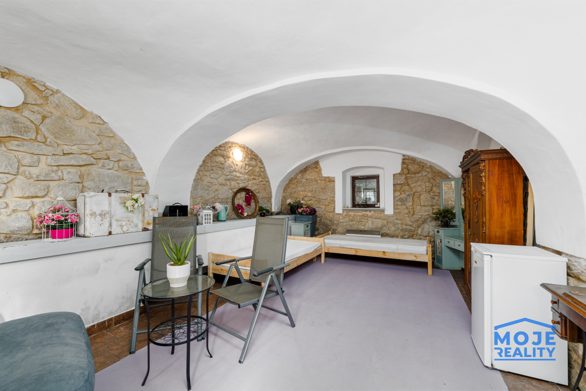 částečně podsklepeno s přípravou na vinárnurenovované dřevěné podlahy, nová okna (trojskla), kompletní renovace dřevěných trámů, koupelen i zázemí